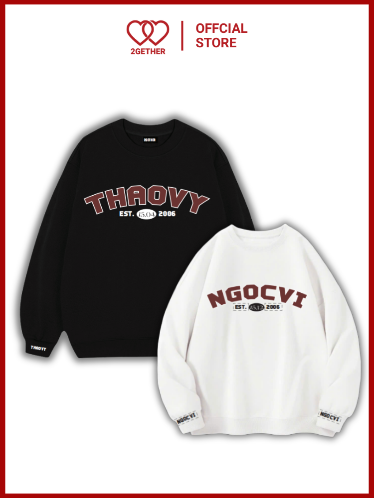 Áo sweater form rộng với thiết kế in tên bản lớn nổi bật ở giữa ngực, tạo điểm nhấn rõ ràng và cá tính. Sản phẩm cho phép in tên theo yêu cầu, phù hợp cho cặp đôi hoặc khách hàng muốn cá nhân hóa áo theo phong cách riêng.